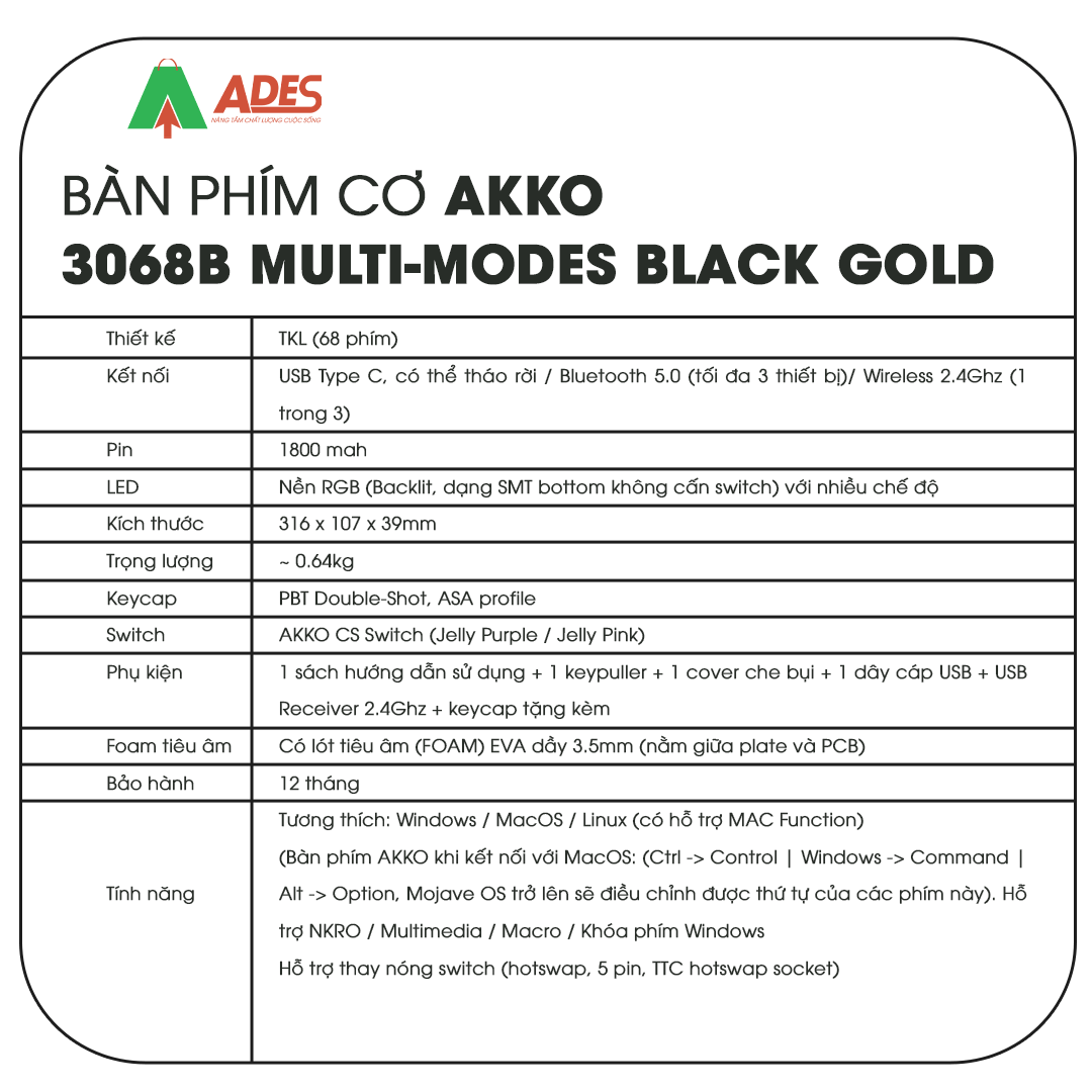 Sản phẩm Bàn phím cơ AKKO 3068B Multi-modes Black Gold hiện đang được phân phối giá rẻ, chính hãng tại điện máy ADES. Để đặt mua sản phẩm, truy cập ngay vào website ADESTECH - HOTLINE 09.7969.1514 hoặc đến địa chỉ 217 Giảng Võ, Hà Nội để xem trực tiếp sản phẩm.