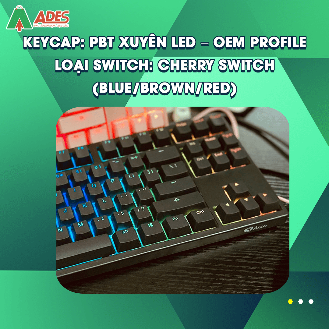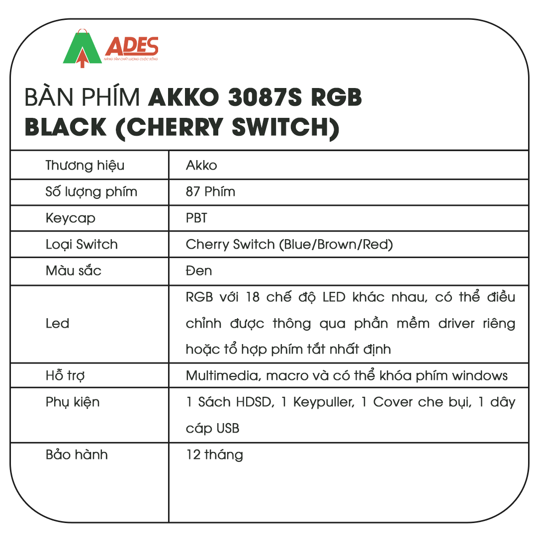 - Bàn phím cơ AKKO 3087S - Black RGB (Cherry sw) sử dụng bộ Switch Cherry MX nổi tiếng đến từ nước Đức, cho cảm giác gõ và độ bền cao với 3 lựa chọn (Blue/Brown/Red). Phù hợp với hầu hết nhu cầu của người dùng.