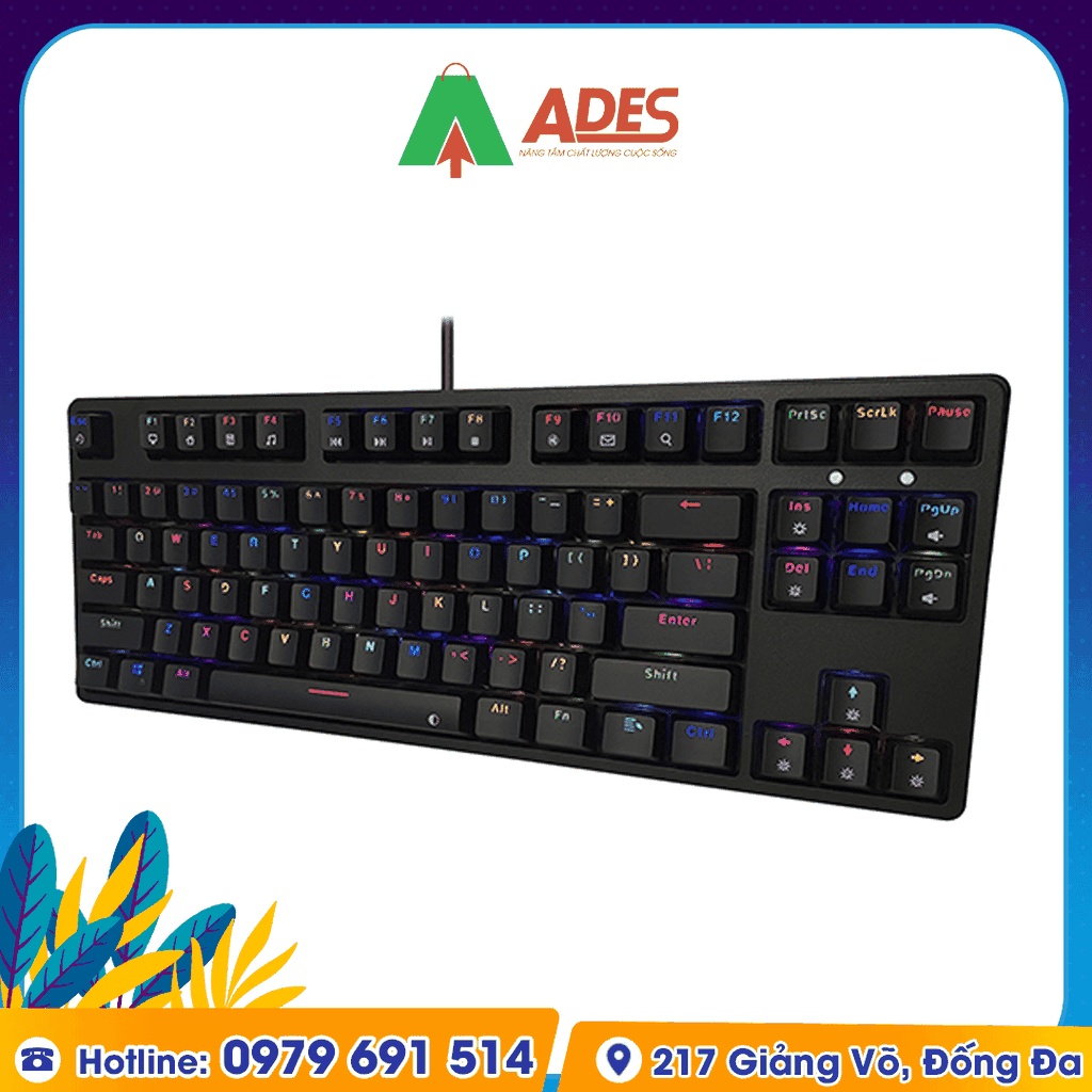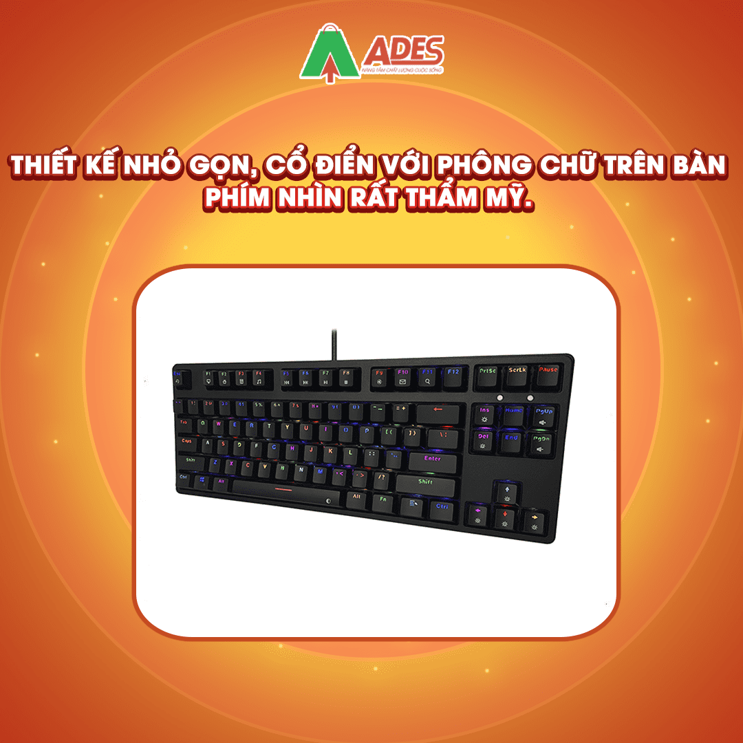 Sản phẩm được thiết kế TKL với 87 phím bấm, thích hợp với mọi nhu cầu sử dụng từ các tác vụ văn phòng tới gaming giải trí. Sản phẩm được sản xuất từ nhựa ABS chất lượng cao, trọng lượng chỉ 855g.