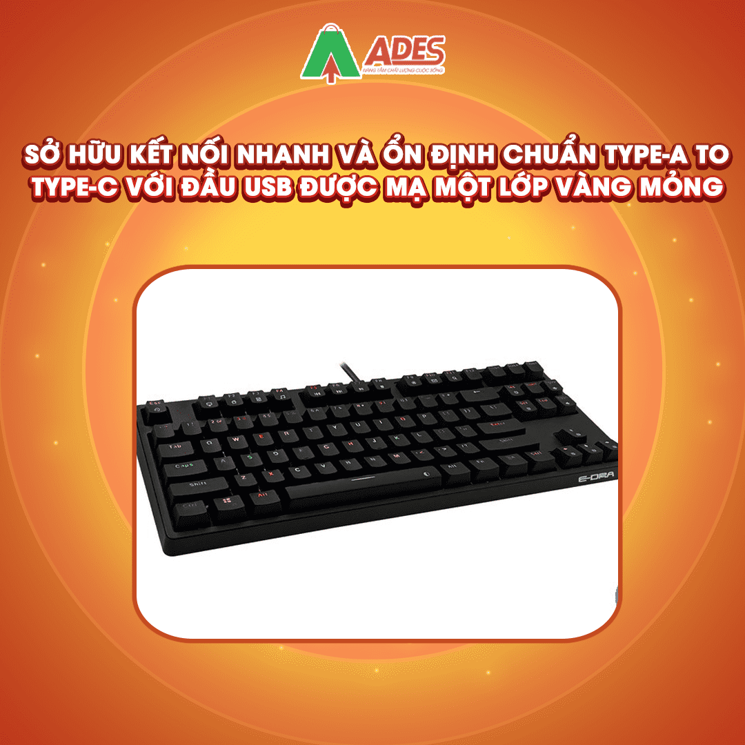 Bàn phím cơ E-DRA EK387L sở hữu kết nối nhanh và ổn định chuẩn Type-A to Type-C với đầu USB được mạ một lớp vàng mỏng, đem lại cảm giác sang trọng và thời thượng cho người sử dụng.