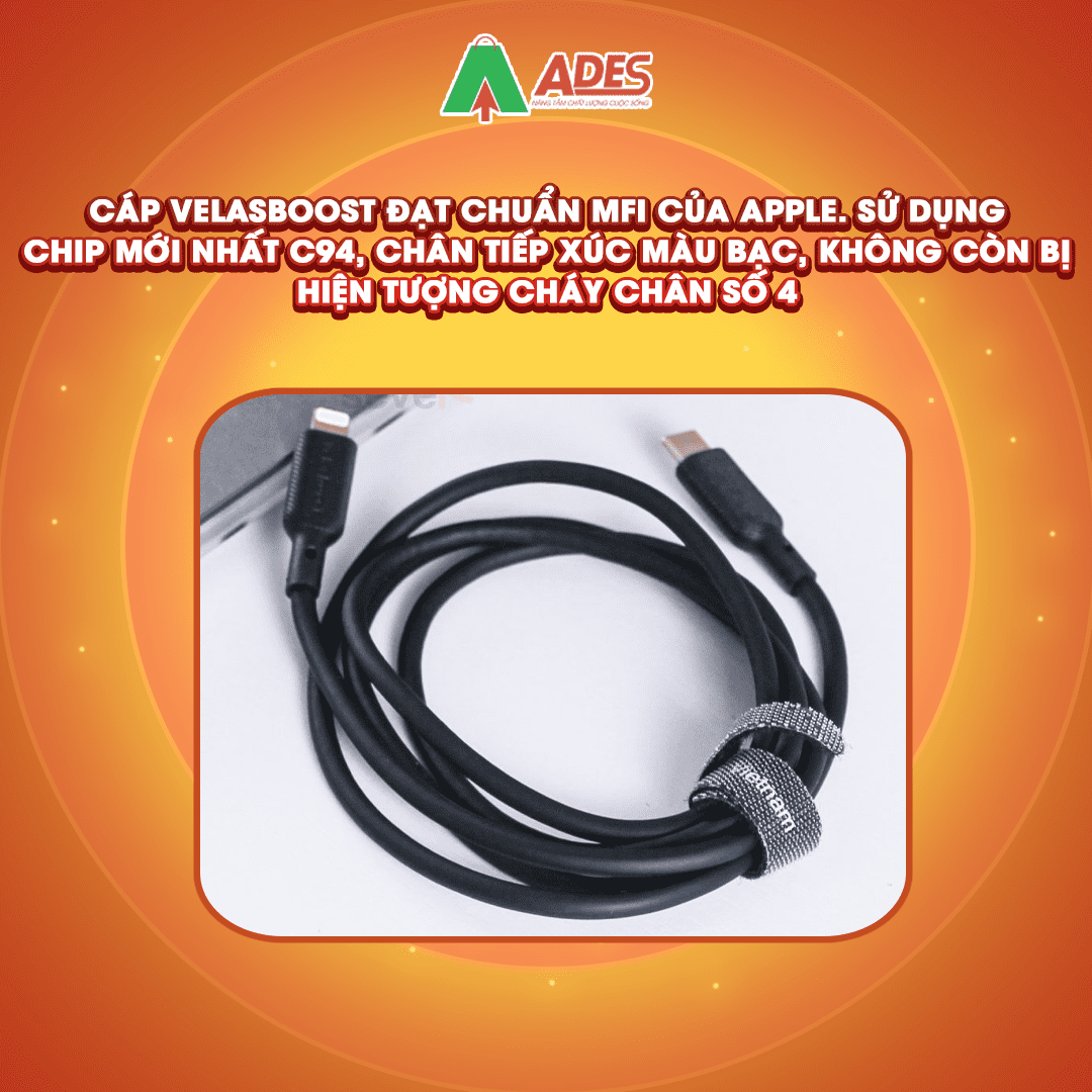Cáp Velasboost đạt chuẩn MFi của Apple. Sử dụng chip mới nhất C94, chân tiếp xúc màu bạc, không còn bị hiện tượng cháy chân số 4.