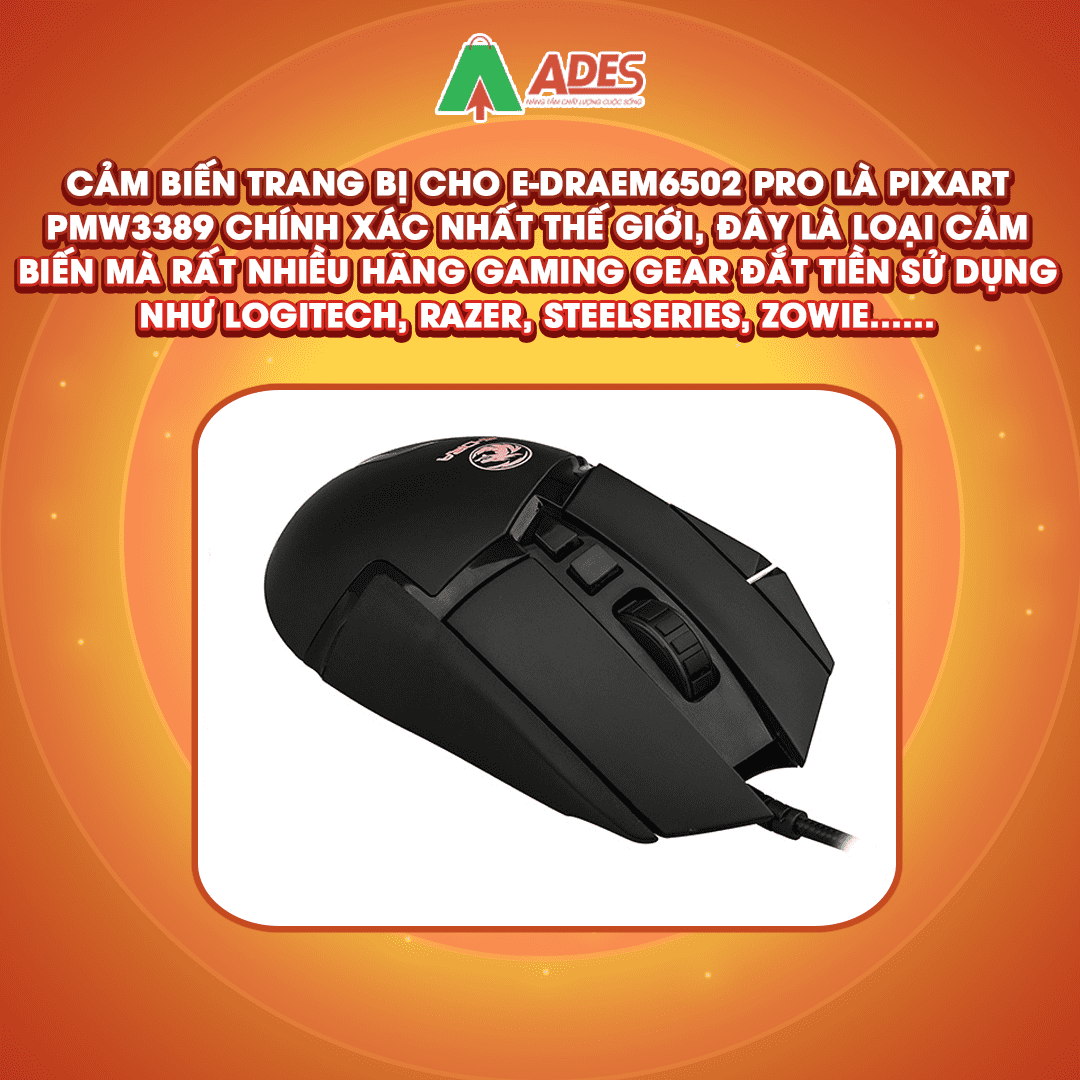 Cảm biến trang bị cho E-DraEM6502 Pro là Pixart PMW3389 chính xác nhất thế giới, đây là loại cảm biến mà rất nhiều hãng gaming gear đắt tiền sử dụng như Logitech, Razer, SteelSeries, Zowie...... Với cảm biến này, game thủ có thể yên tâm rằng EM6502 Pro sẽ cho chộ đính xác vượt trội và đủ đáp ứng cho game thủ ở đẳng cấp cao nhất.