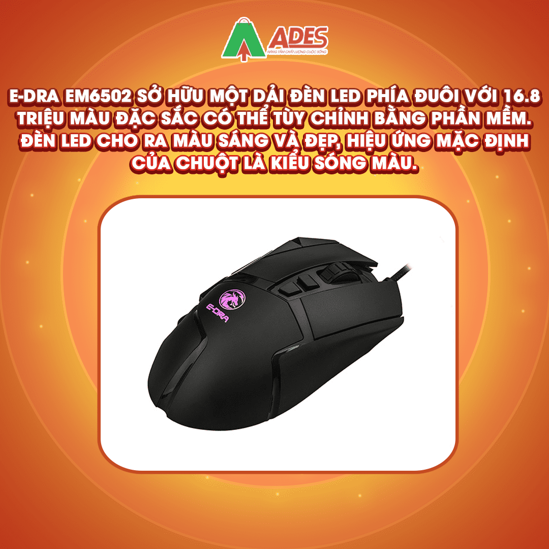 E-Dra EM6502 sở hữu một dải đèn LED phía đuôi với 16.8 triệu màu đặc sắc có thể tùy chỉnh bằng phần mềm. Đèn LED cho ra màu sáng và đẹp, hiệu ứng mặc định của chuột là kiểu sóng màu.