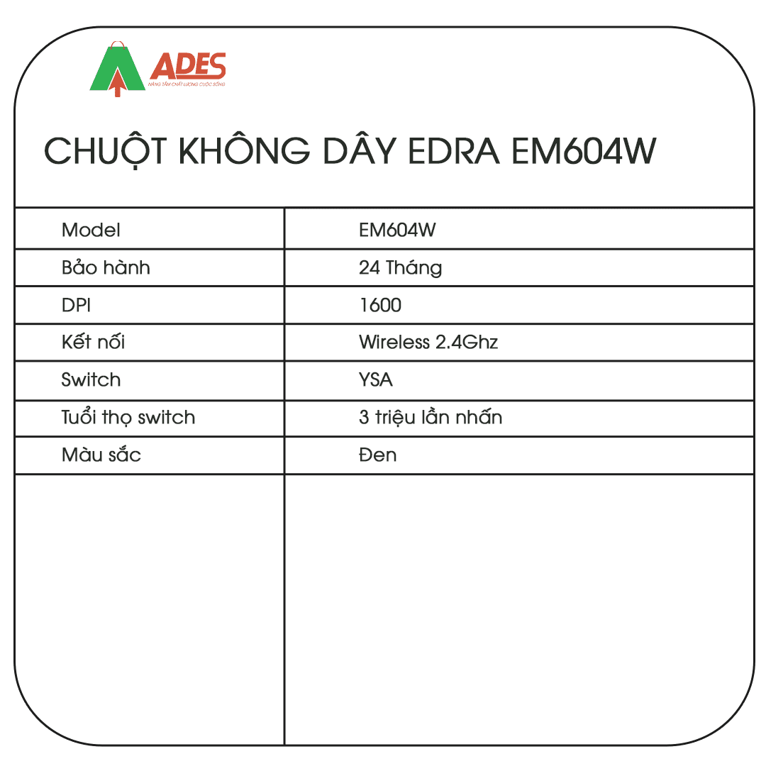 Chuột không dây Edra EM604W hiện đang được phân phối giá rẻ, chính hãng tại điện máy ADES. Để đặt mua sản phẩm, truy cập ngay vào website ADESTECH - HOTLINE 09.7969.1514 hoặc đến địa chỉ 217 Giảng Võ, Hà Nội để xem trực tiếp sản phẩm.