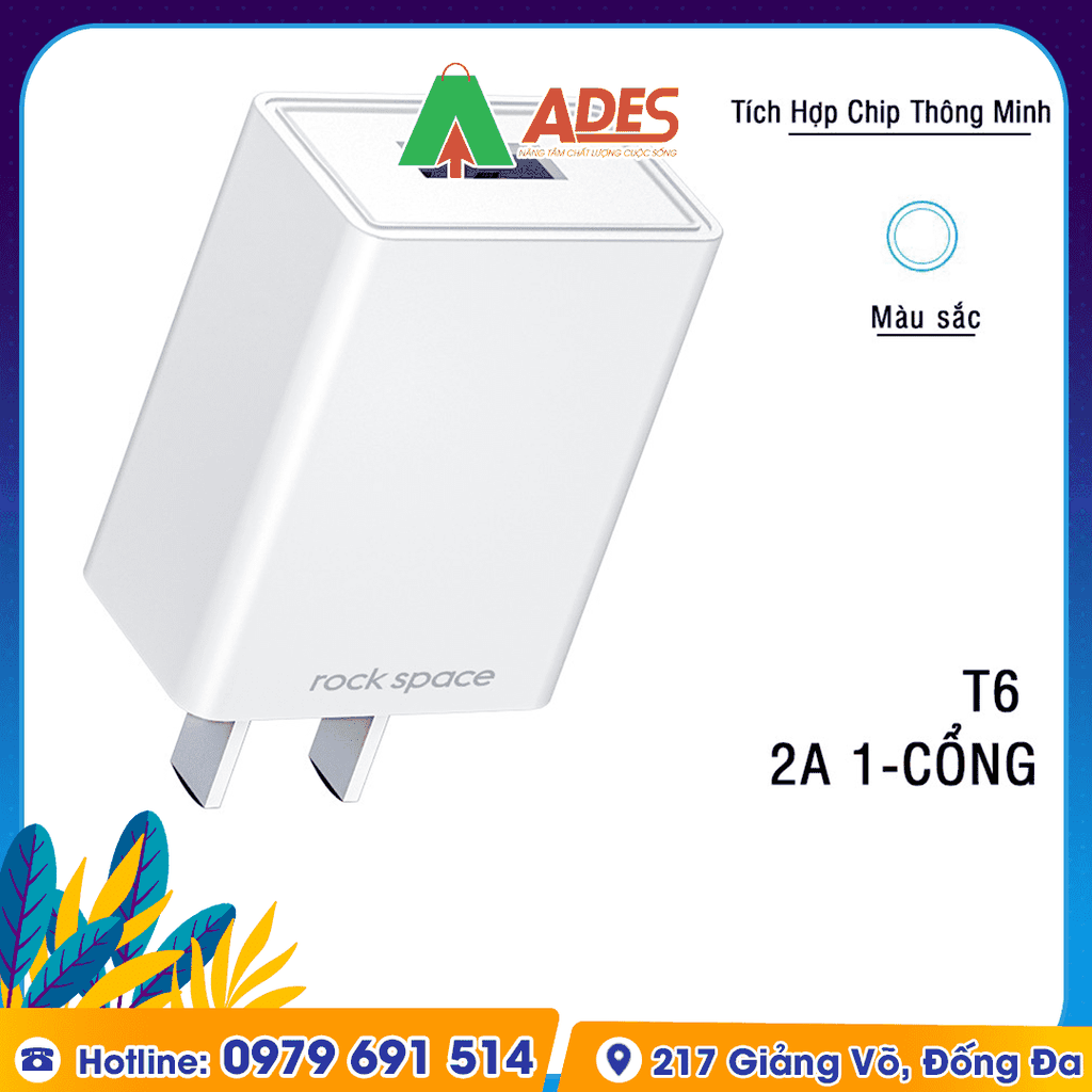 - Rockspace T6 2A sạc nhanh, ổn định cho iphone 6,ip7,ip8, Samsung và các dòng điện thoại khác, bạn không lo nóng máy, chai pin với củ sạc này