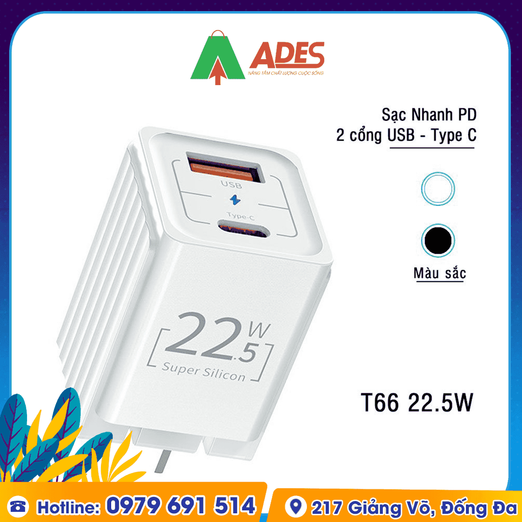 - Củ sạc nhanh T66 tích hợp 2 cổng sạc nhanh 22.5W và 20W