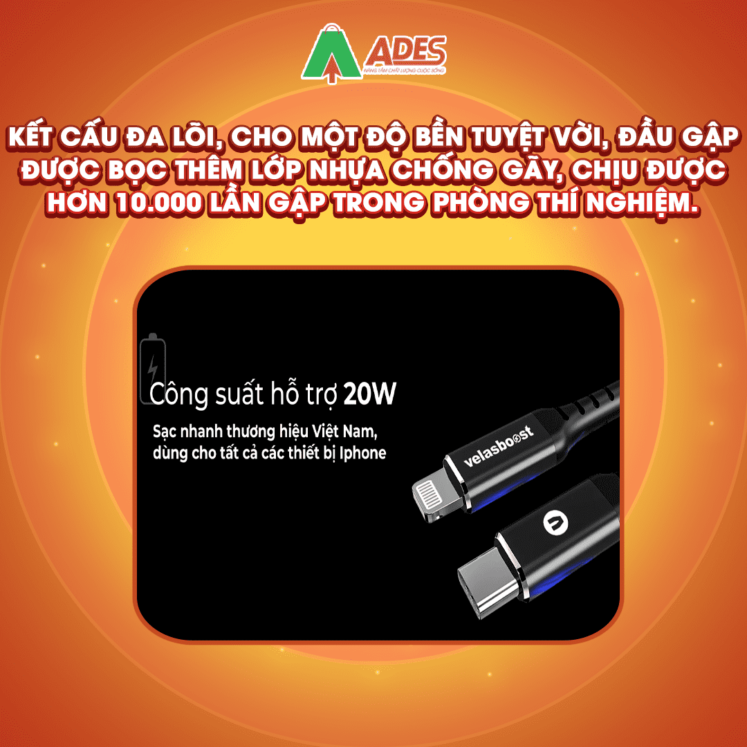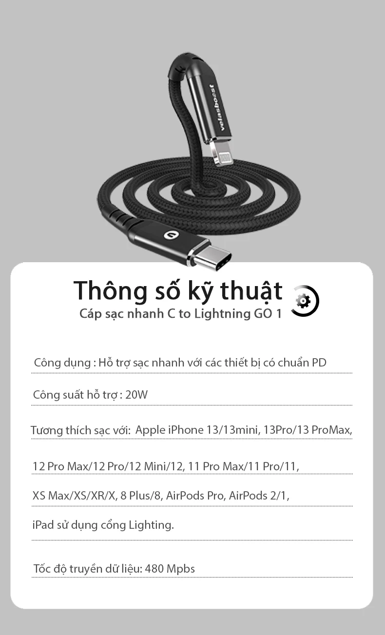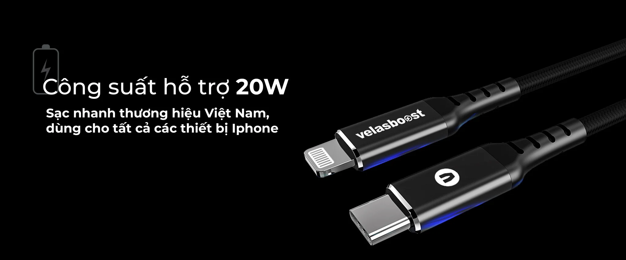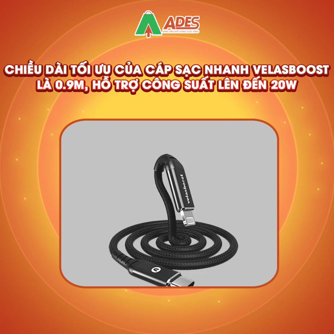 Chiều dài tối ưu của cáp sạc nhanh Velasboost là 0.9m, hỗ trợ công suất lên đến 20W