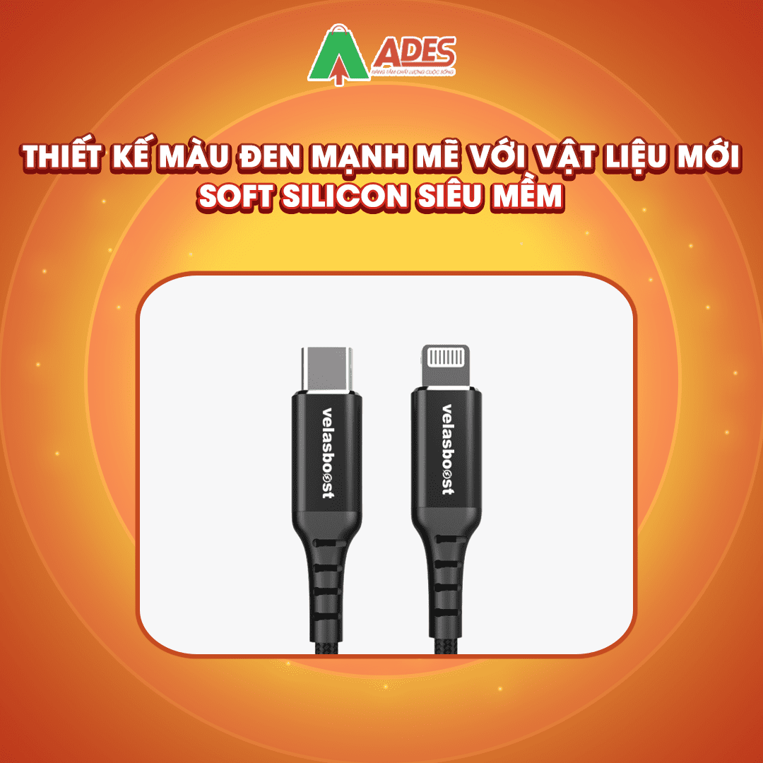 Cáp sạc Velasboost 20W được thiết kế màu đen mạnh mẽ với vật liệu mới Soft Silicon siêu mềm
