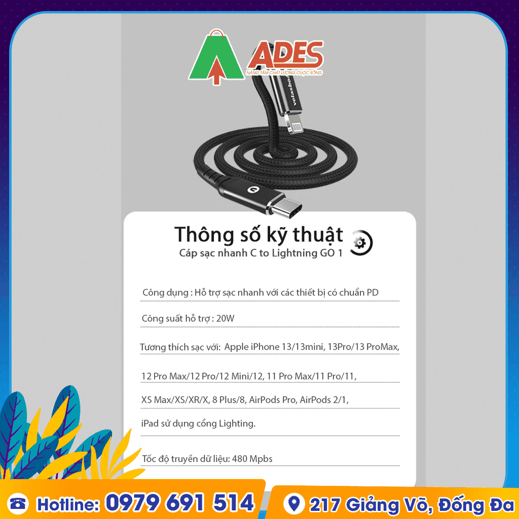Dây Cáp sạc nhanh C to Lightning GO 1 là một trong những sợi cáp được phát triển và thiết kế bởi người Việt. Với nhiều công nghệ tiên tiến được tích hợp, hỗ trợ công nghệ sạc nhanh mới nhất hiện nay trên các dòng iPhone và iPad có hỗ trợ sạc nhanh. Hãy cùng ADES Vietnam tìm hiểu thêm về sản phẩm này nhé