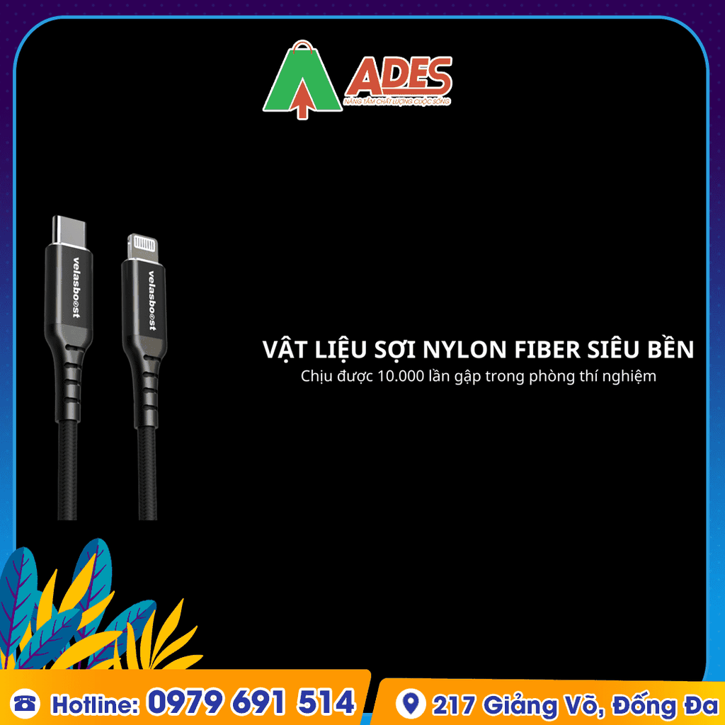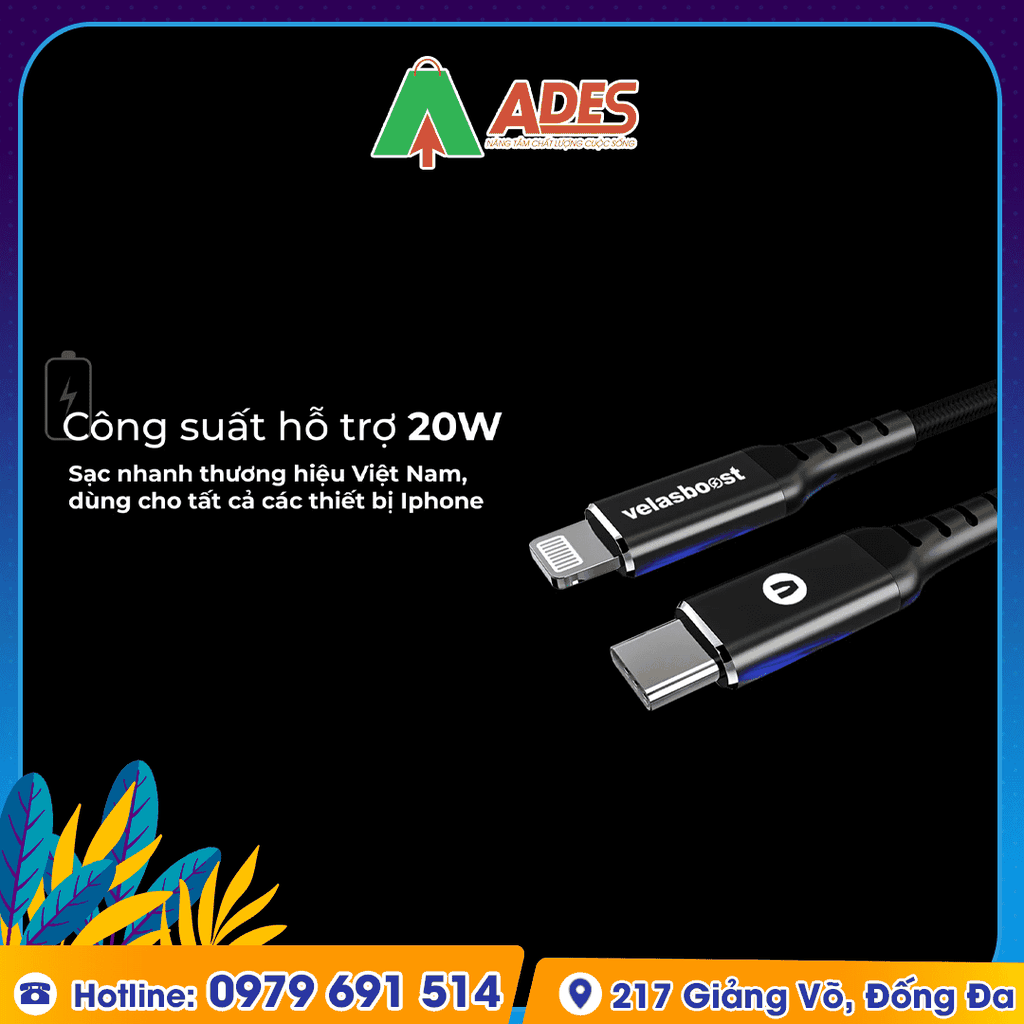 Sản phẩm Dây Cáp sạc nhanh Velasboost C to Lightning GO 1 hiện đang được phân phối giá rẻ, chính hãng tại điện máy ADES. Để đặt mua sản phẩm, truy cập ngay vào website ADESTECH - HOTLINE 09.7969.1514 hoặc đến địa chỉ 217 Giảng Võ, Hà Nội để xem trực tiếp sản phẩm.