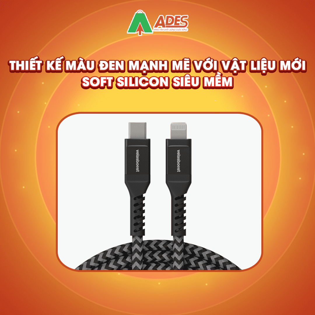Cáp sạc Velasboost 20W được thiết kế màu đen mạnh mẽ với vật liệu mới Soft Silicon siêu mềm