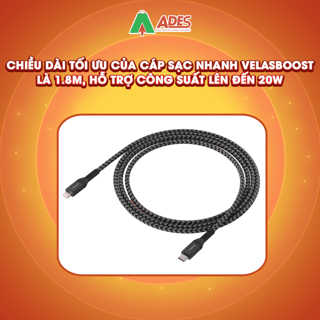 Chiều dài tối ưu của cáp sạc nhanh Velasboost là 1.8m, hỗ trợ công suất lên đến 20W