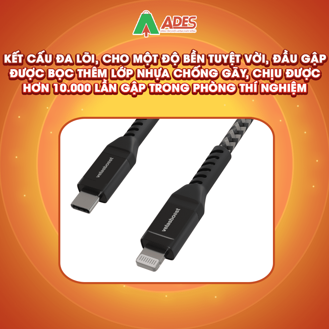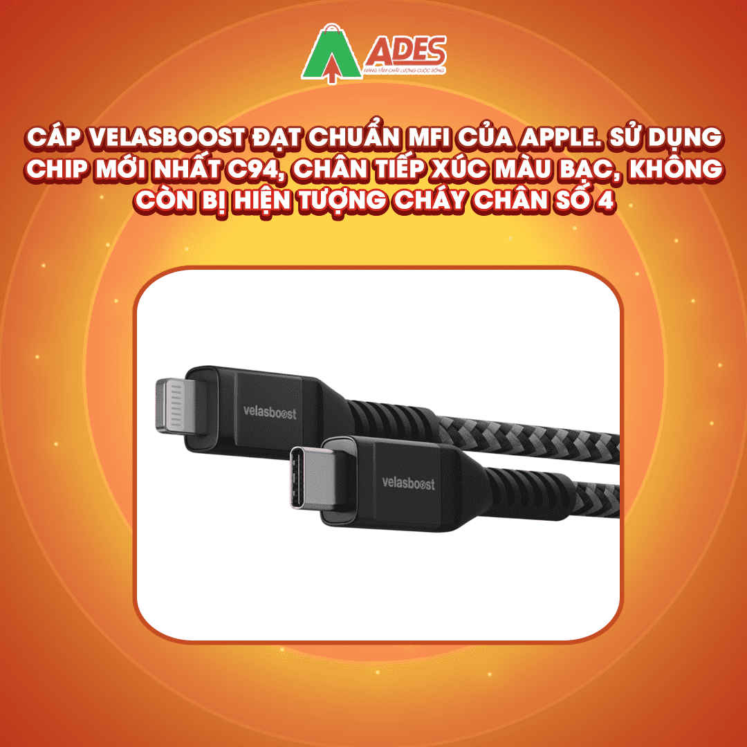Cáp Velasboost đạt chuẩn MFi của Apple. Sử dụng chip mới nhất C94, chân tiếp xúc màu bạc, không còn bị hiện tượng cháy chân số 4.