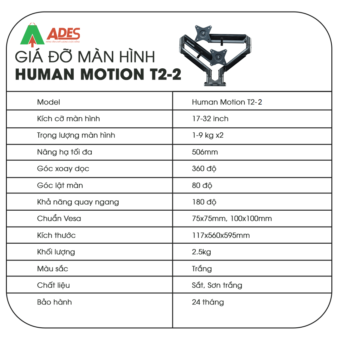 Giá đỡ màn hình máy tính Human Motion T2-2 hiện đang được phân phối giá rẻ, chính hãng tại điện máy ADES. Để đặt mua sản phẩm, truy cập ngay vào website Điện máy ADES - HOTLINE 09.7969.1514 hoặc đến địa chỉ 217 Giảng Võ, Hà Nội để xem trực tiếp sản phẩm.