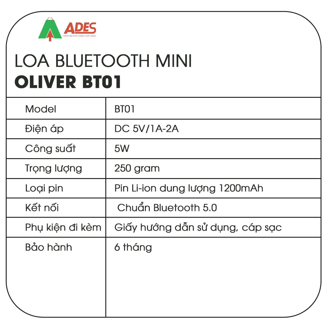 Loa Bluetooth Mini OLIVER BT01 là thiết bị âm thanh với thiết kế không dây, sử dụng tính năng Bluetooth hiện đại. Bạn có thể dễ dàng kết nối thiết bị này với bất kỳ điện thoại hay máy tính có Bluetooth để phát nhạc, âm thanh và là sản phẩm hỗ trợ nghe nhạc chất lượng, mang đến cho bạn trải nghiệm âm thanh thực tế và sống động hơn.