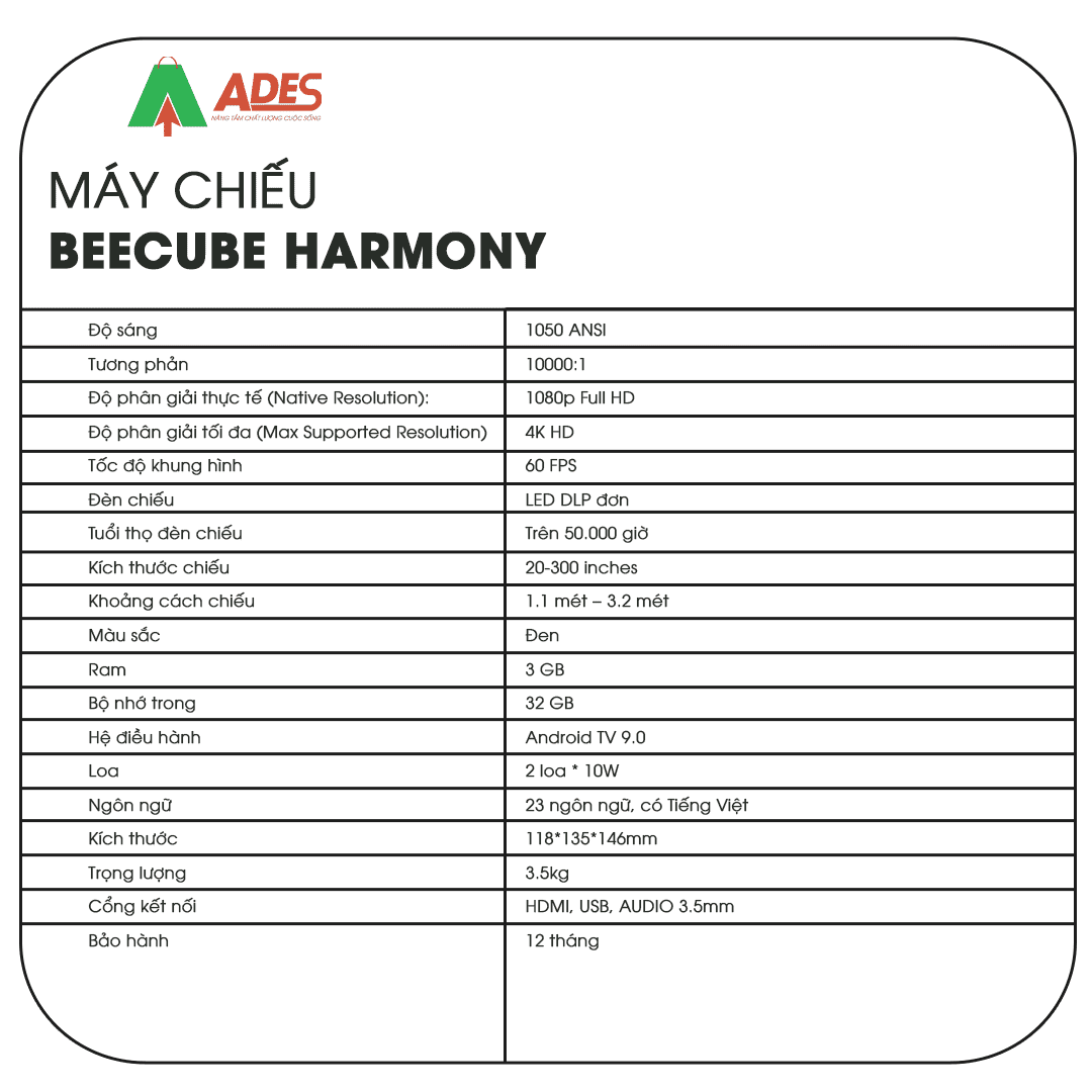 Sản phẩm Máy chiếu Beecube Harmony hiện đang được phân phối chính hãng tại ADESTECH, khách hàng có nhu cầu mua bán sỉ, bán buôn sản phẩm liên hệ ngay HOTLINE 09.7969.1514 hoặc địa chỉ 217 Giảng Võ để được tư vấn trực tiếp tại khu vực nội thành Hà Nội