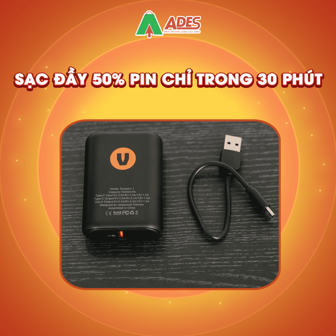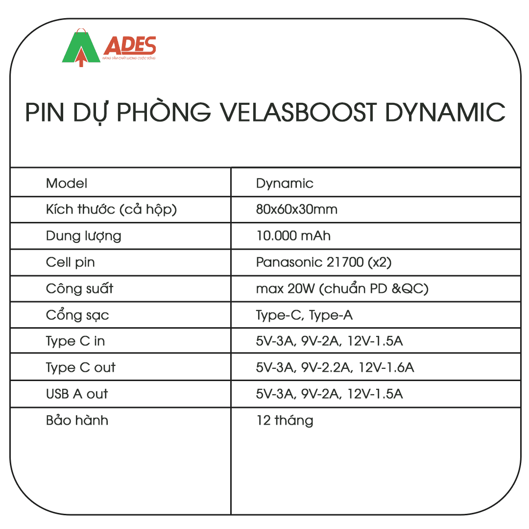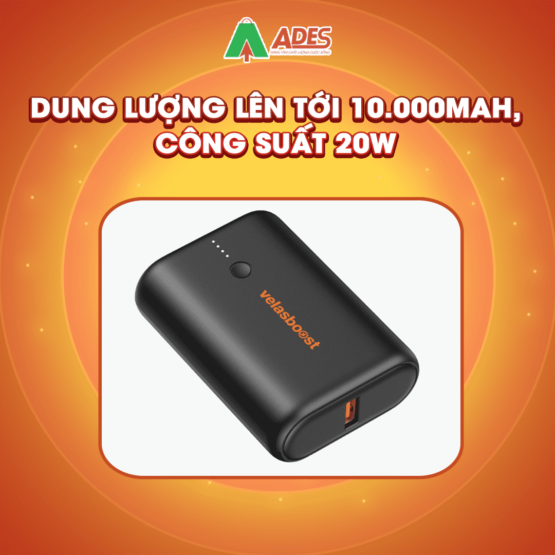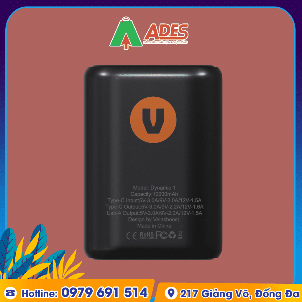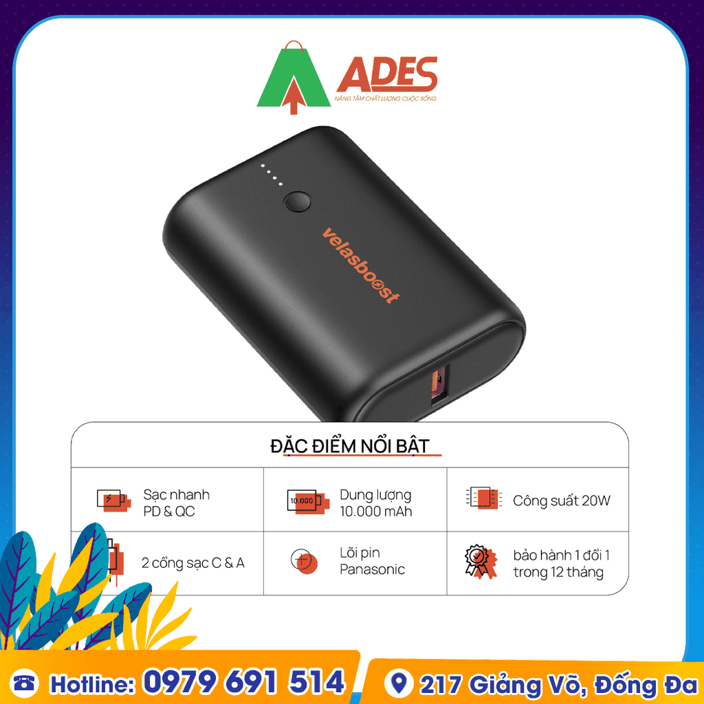 Sản phẩm Pin dự phòng Velasboost Dynamic - 10.000 mAh/20.000 mAh 20W hiện đang được phân phối giá rẻ, chính hãng tại điện máy ADES. Để đặt mua sản phẩm, truy cập ngay vào website ADESTECH - HOTLINE 09.7969.1514 hoặc đến địa chỉ 217 Giảng Võ, Hà Nội để xem trực tiếp sản phẩm.
