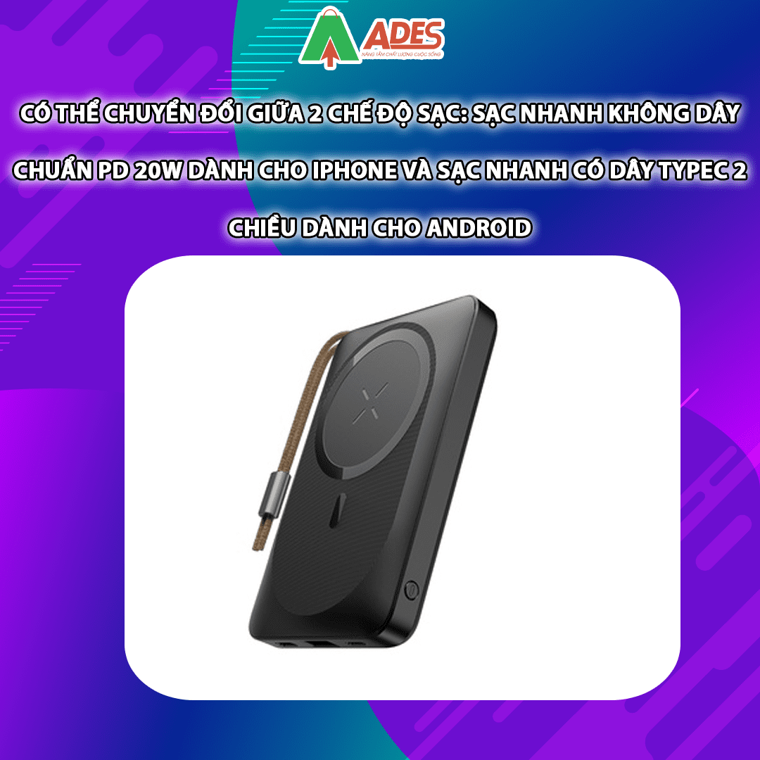 Có thể chuyển đổi giữa 2 chế độ sạc: sạc nhanh không dây chuẩn PD 20W dành cho iphone và sạc nhanh có dây typeC 2 chiều dành cho android công suất 10000mAh.