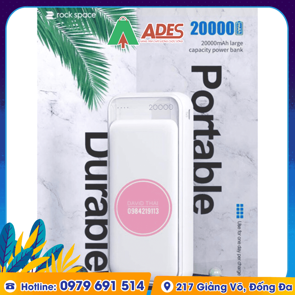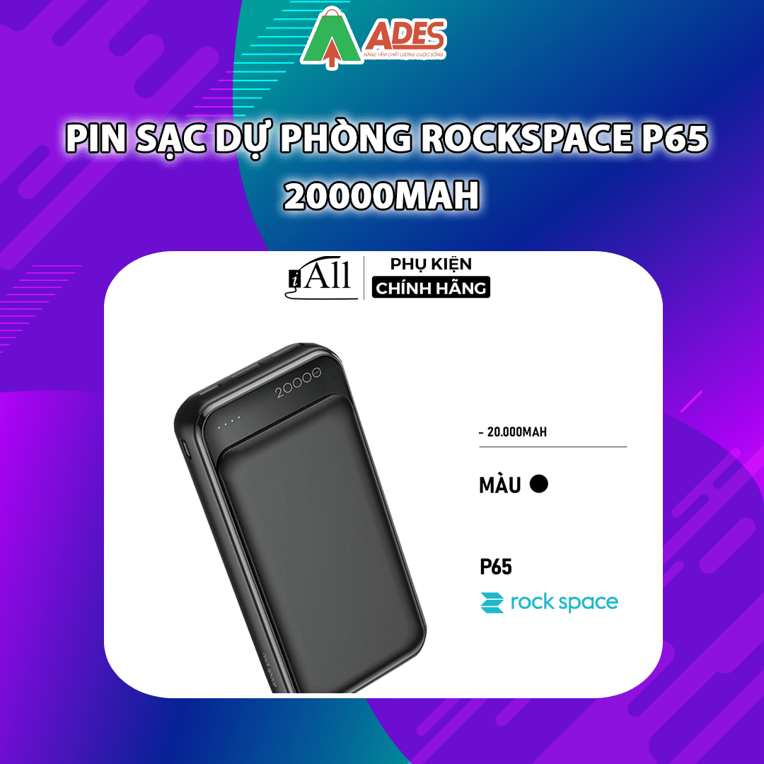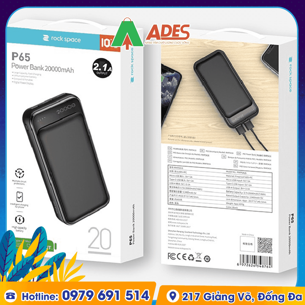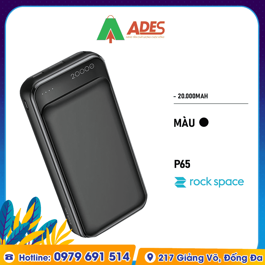 Sản phẩm Pin sạc dự phòng Rockspace P65 20000mAh hiện đang được phân phối giá rẻ, chính hãng tại điện máy ADES. Để đặt mua sản phẩm, truy cập ngay vào website ADESTECH - HOTLINE 09.7969.1514 hoặc đến địa chỉ 217 Giảng Võ, Hà Nội để xem trực tiếp sản phẩm.