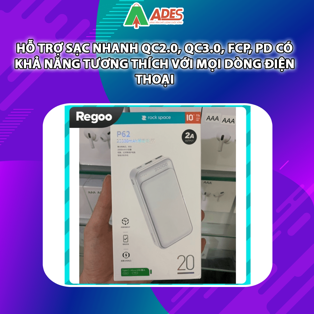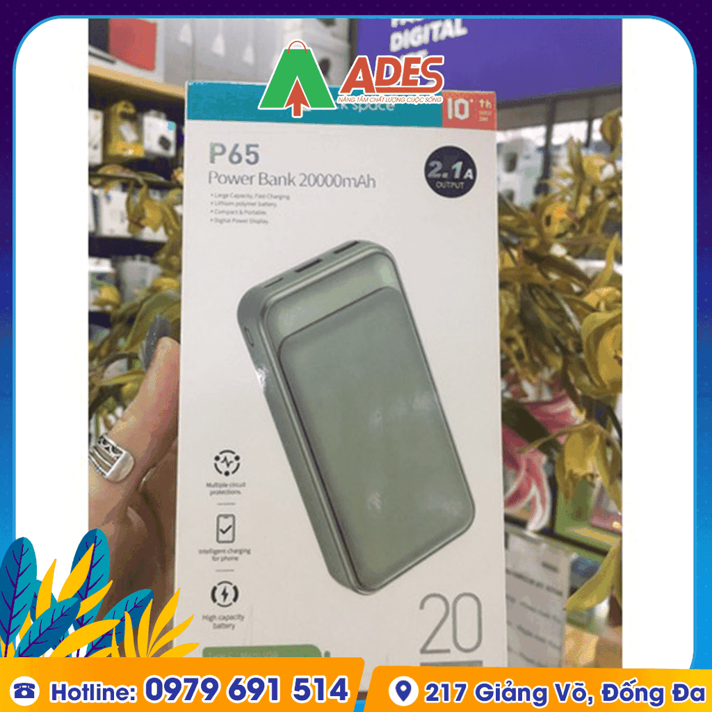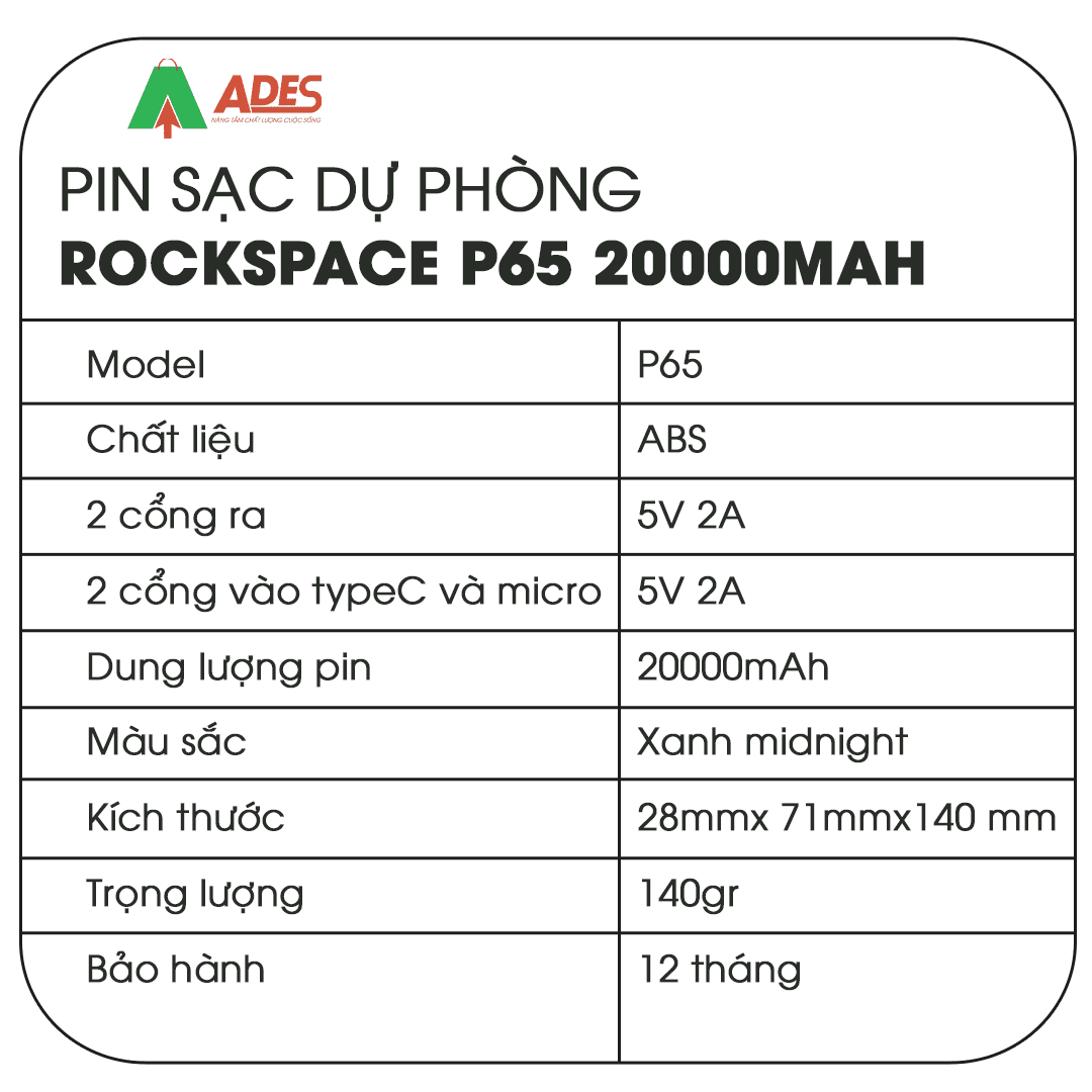 Sản phẩm Pin sạc dự phòng Rockspace P65 20000mAh hiện đang được phân phối giá rẻ, chính hãng tại điện máy ADES. Để đặt mua sản phẩm, truy cập ngay vào website ADESTECH - HOTLINE 09.7969.1514 hoặc đến địa chỉ 217 Giảng Võ, Hà Nội để xem trực tiếp sản phẩm.