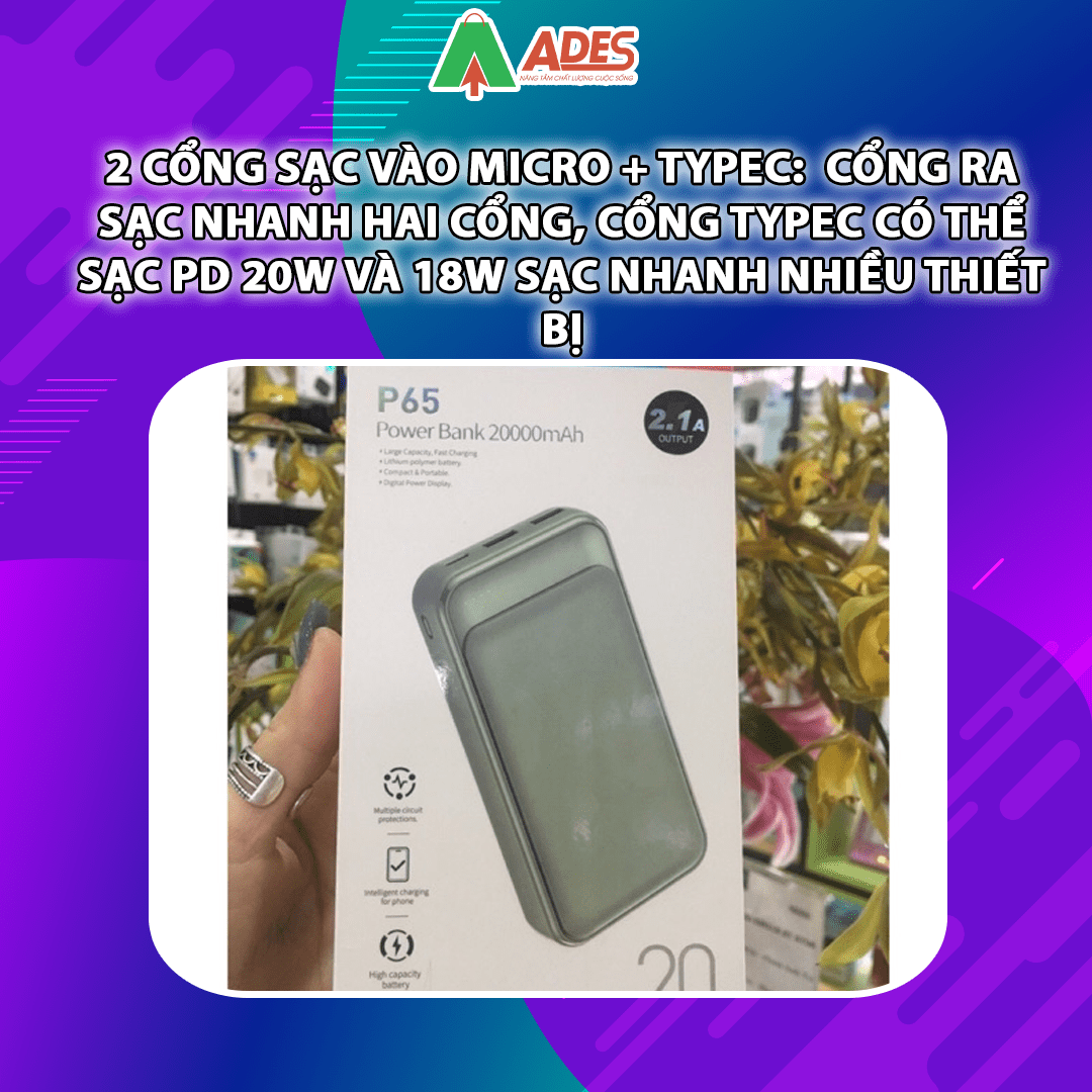 Pin dự phòng Rockspace P65 có 2 cổng sạc vào micro + typeC: cổng ra sạc nhanh hai cổng, cổng typeC có thể sạc PD 20W và 18W sạc nhanh nhiều thiết bị