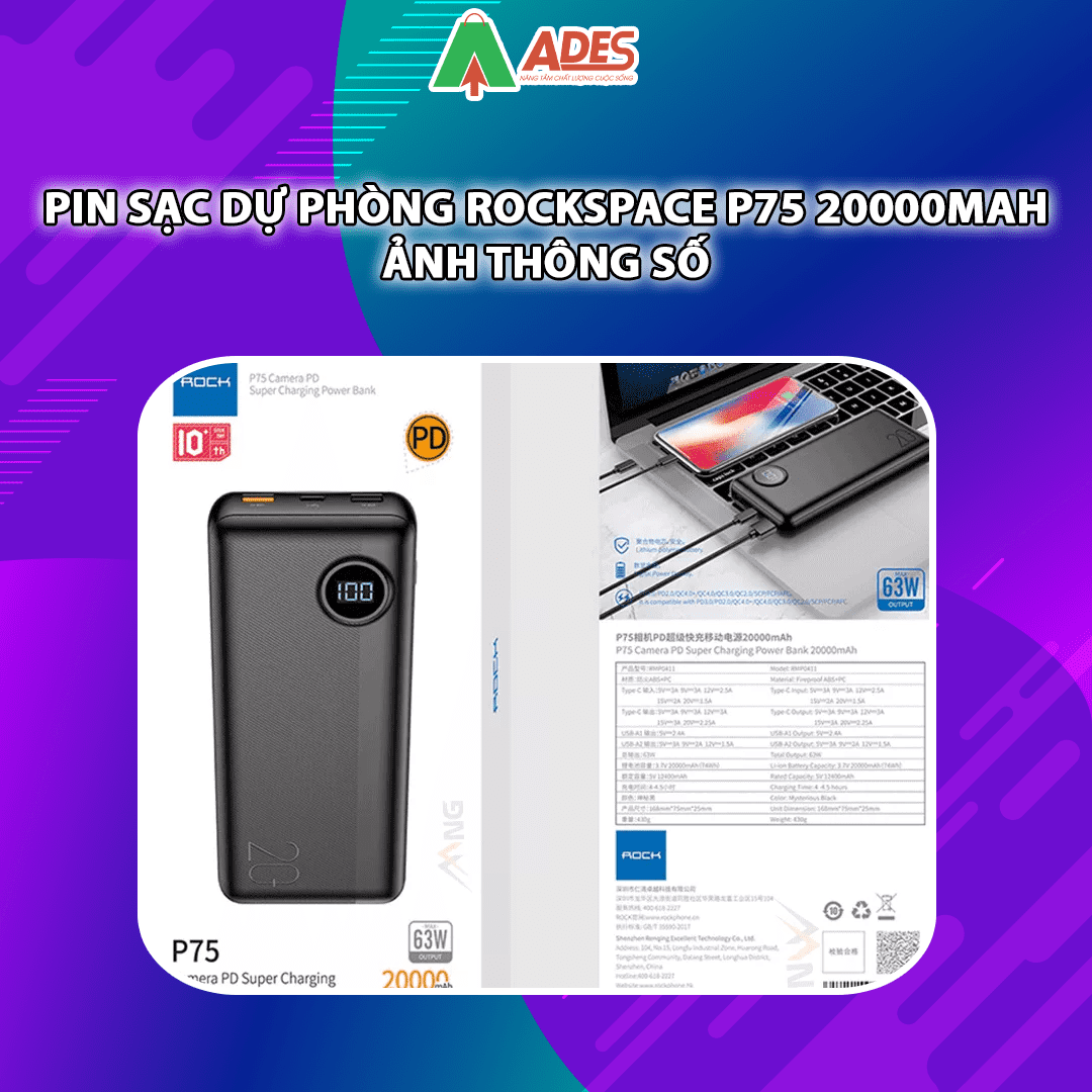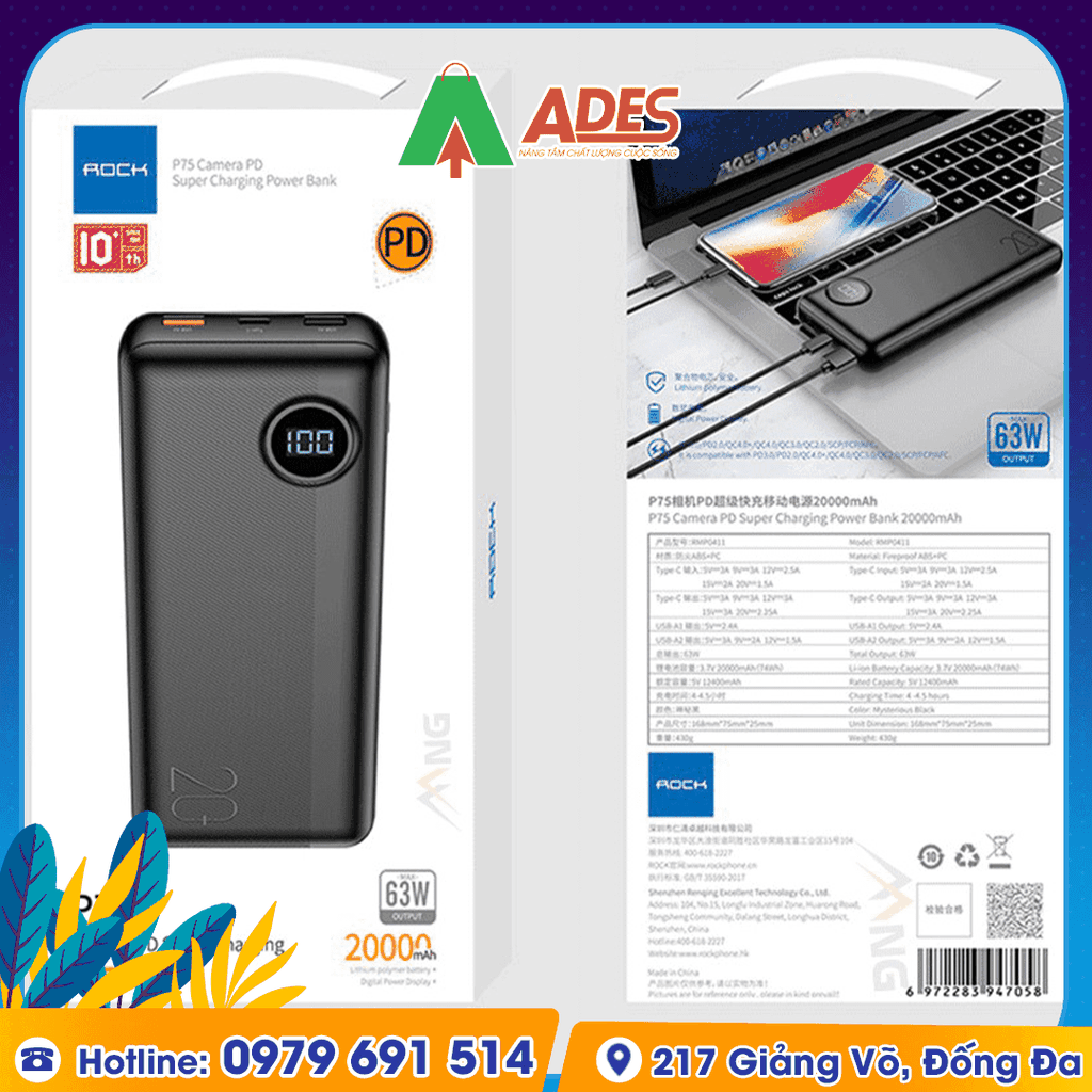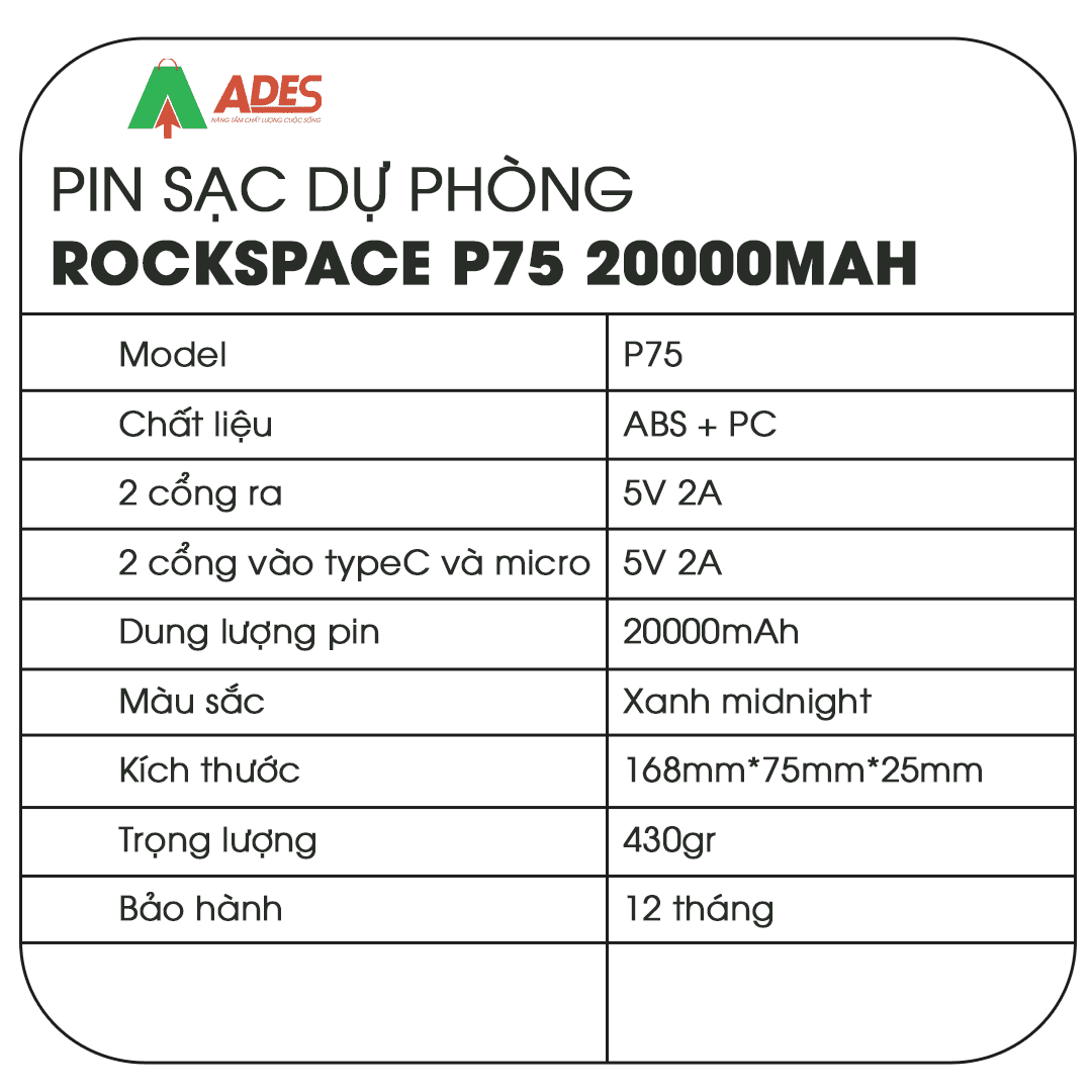 Sản phẩm Pin sạc dự phòng Rockspace P75 20000mAh hiện đang được phân phối giá rẻ, chính hãng tại điện máy ADES. Để đặt mua sản phẩm, truy cập ngay vào website ADESTECH - HOTLINE 09.7969.1514 hoặc đến địa chỉ 217 Giảng Võ, Hà Nội để xem trực tiếp sản phẩm.