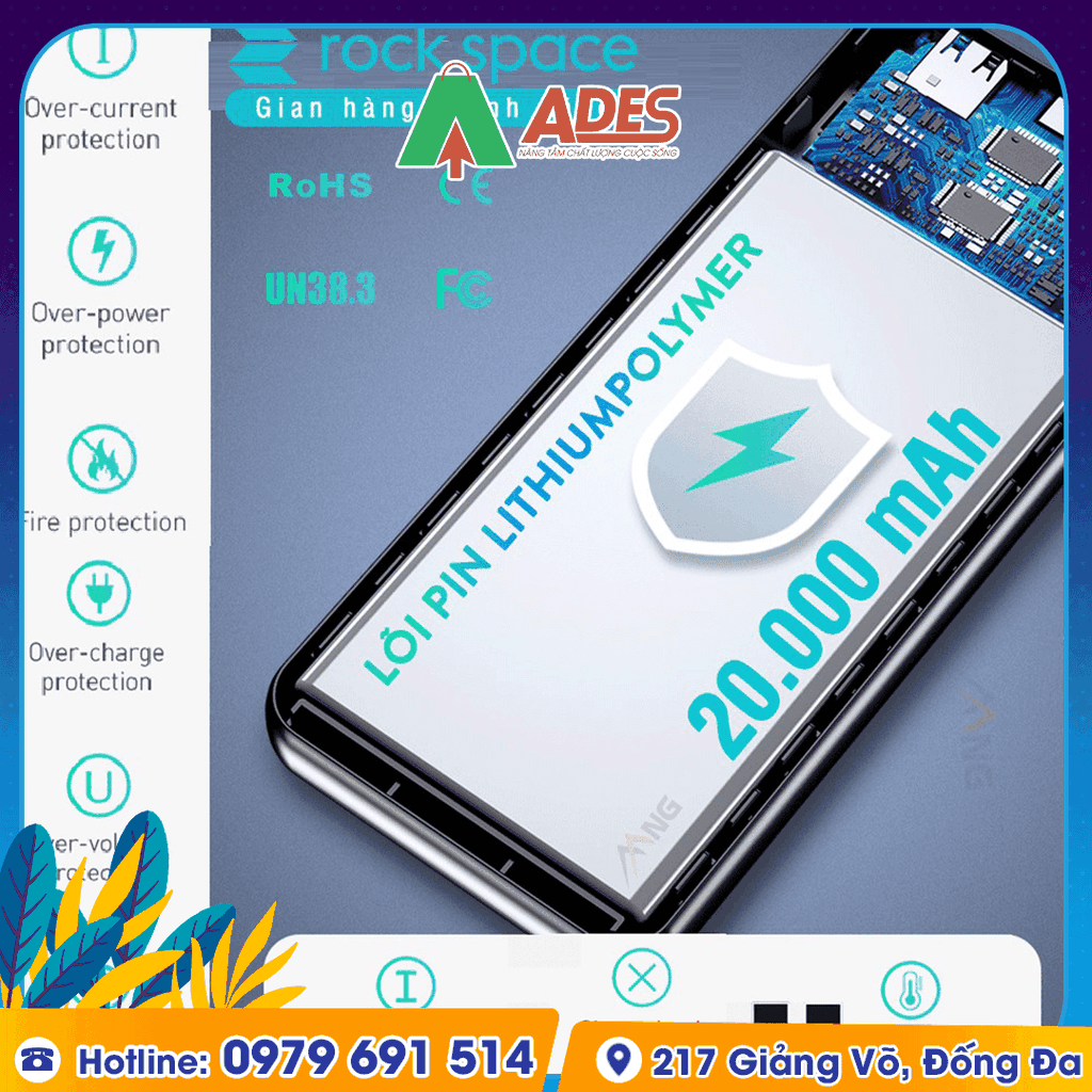 Pin sạc dự phòng Rockspace có lõi pin làm bằng lithiumpolymer siêu bền,dung lượng 20.000 mAh