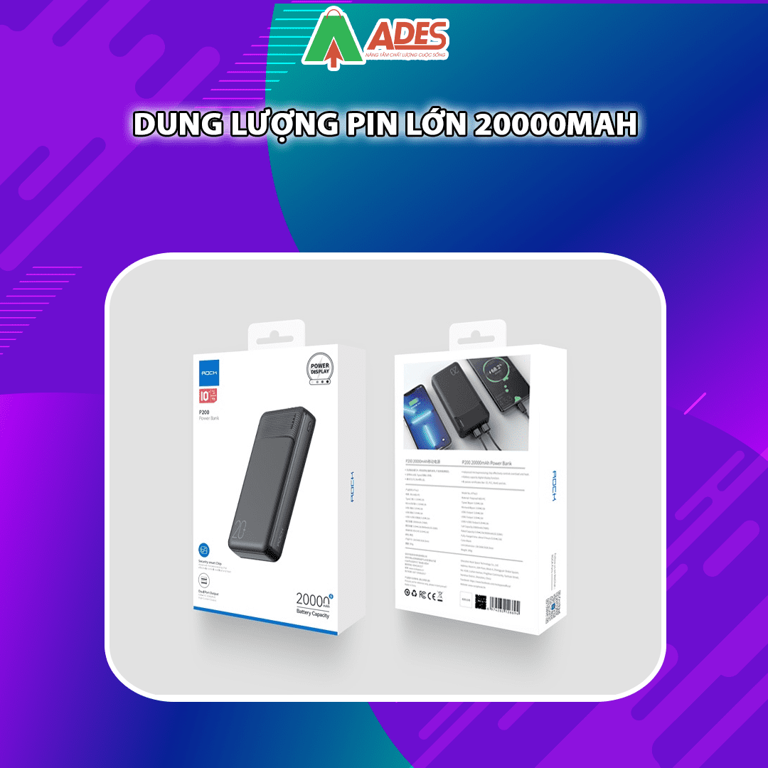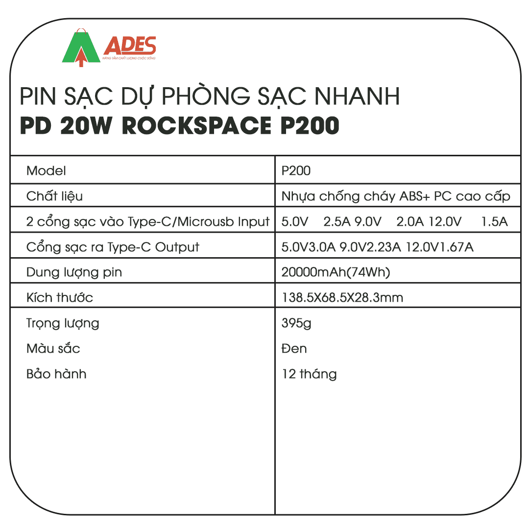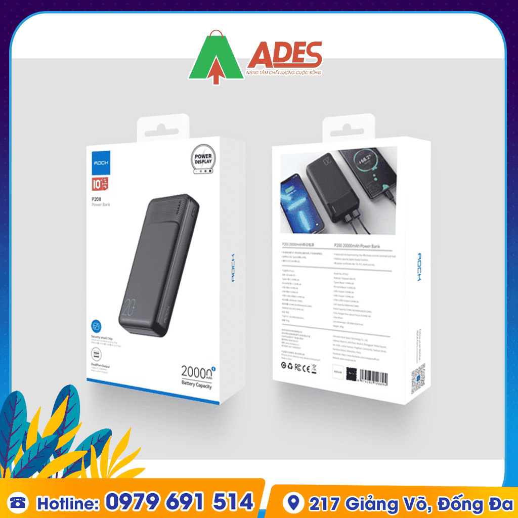 Sản phẩm Pin sạc dự phòng sạc nhanh PD 20W Rockspace P200 dung lượng 20000mAh hiện đang được phân phối giá rẻ, chính hãng tại điện máy ADES. Để đặt mua sản phẩm, truy cập ngay vào website ADESTECH - HOTLINE 09.7969.1514 hoặc đến địa chỉ 217 Giảng Võ, Hà Nội để xem trực tiếp sản phẩm.