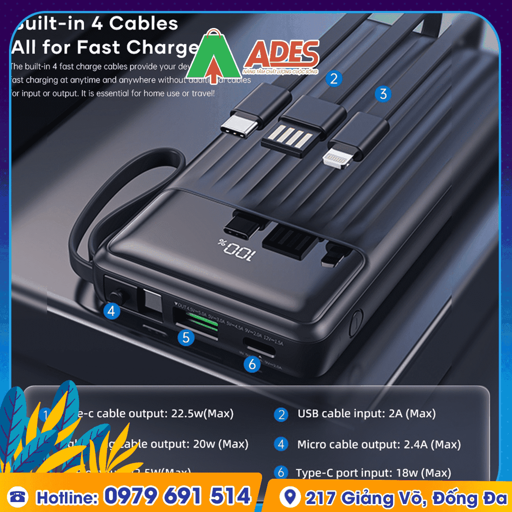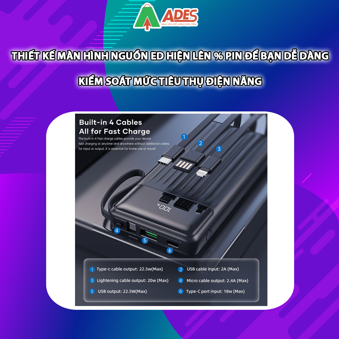 Pin sạc dự phòng có dung lượng pin lớn 10000mAh, tích hợp 4 cáp đầu ra sạc được cho mọi loại thiết bị, hỗ trợ sạc nhanh PD QC 22.5W/ 20W.
