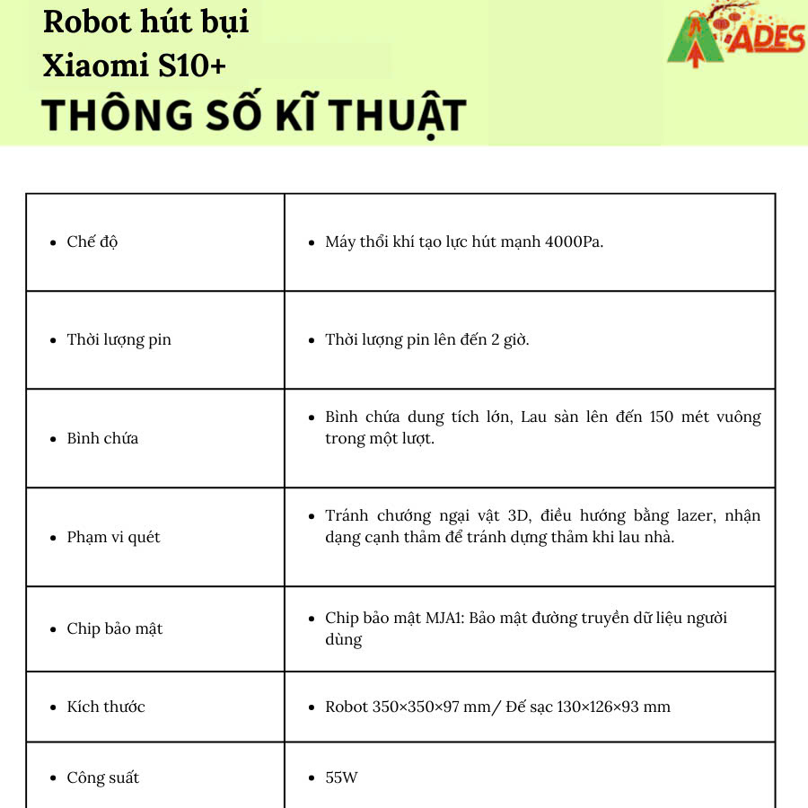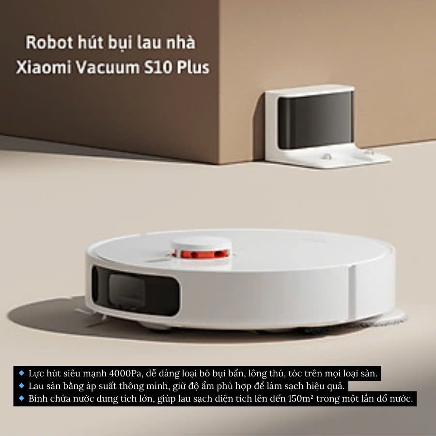 Bạn đang tìm kiếm một robot hút bụi thông minh, nhỏ gọn nhưng hiệu suất mạnh mẽ? Xiaomi S10+ sẽ là trợ thủ đắc lực, giúp bạn tiết kiệm thời gian và giữ cho ngôi nhà luôn sạch sẽ. Với lực hút mạnh 4000Pa, điều hướng laser chính xác, lau sàn áp suất thông minh và khả năng kết nối ứng dụng, đây là sản phẩm đáng sở hữu trong mọi gia đình hiện đại.