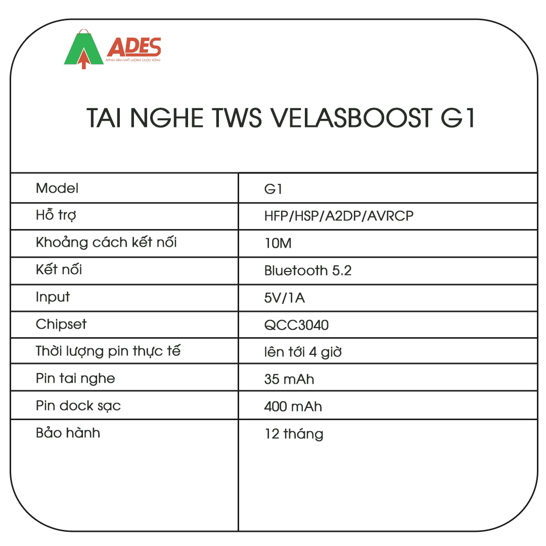 Tai nghe TWS Velasboost G1 là mẫu tai nghe gaming tới từ một thương hiệu tại Việt Nam. Đây là một trong những chiếc tai nghe có giá thành rẻ được Velasboost giới thiệu tới người dùng trong thời gian vừa qua. Hãy cùng ADES Vietnam tìm hiểu thêm về sản phẩm này nhé